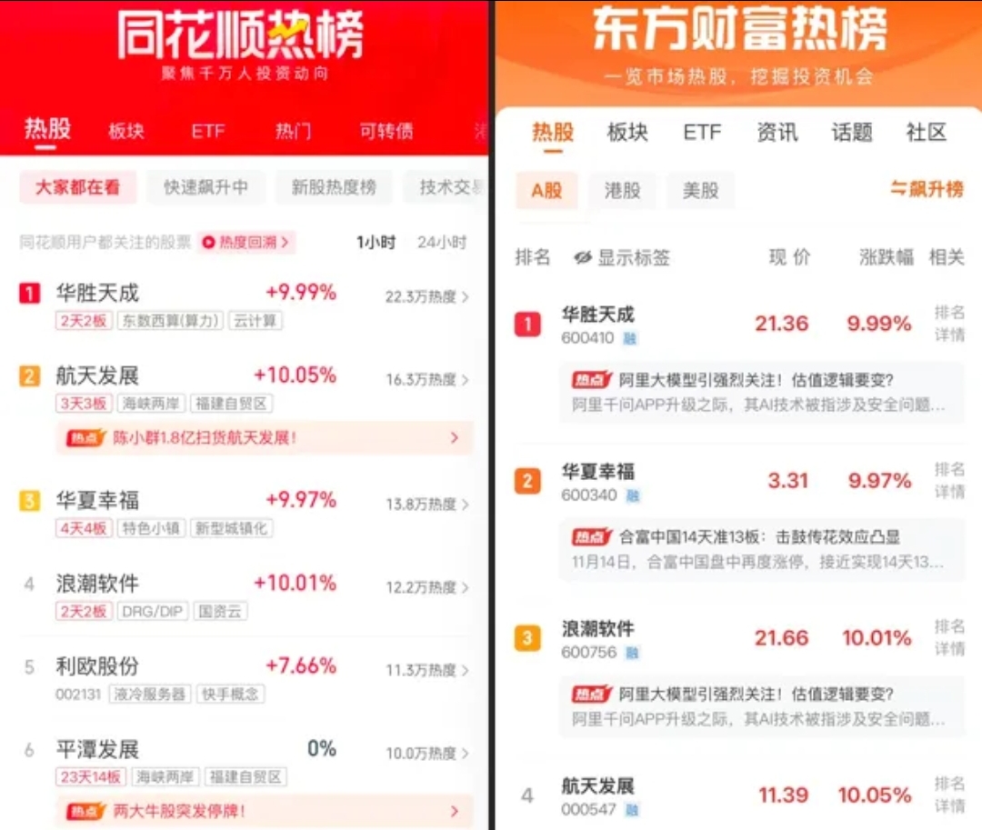 同花顺热榜:华胜天成、航天发展、华夏幸福、浪潮软件、利欧股份