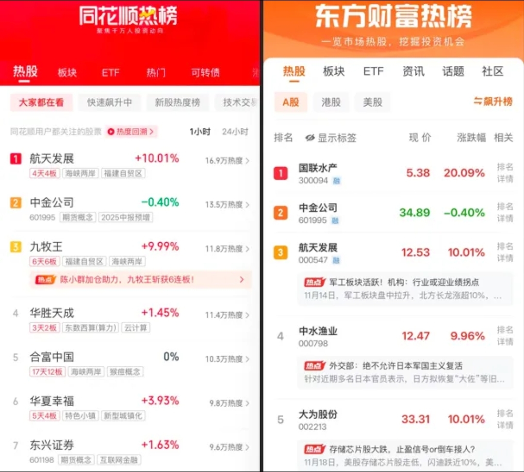 同花顺热榜:航天发展、中金公司、九牧王、华胜天成、合富中国