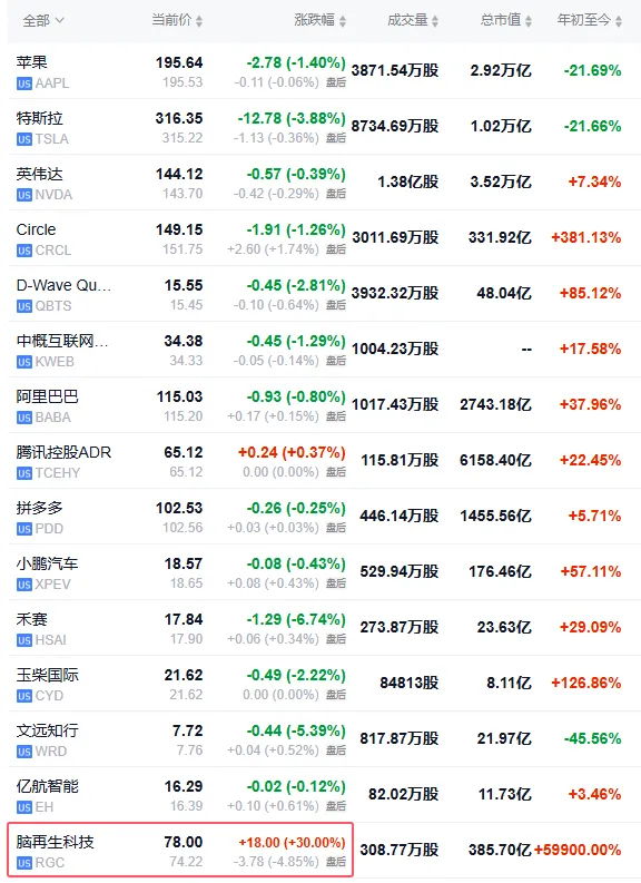 事件:6月16日晚,美股脑再生科技涨超283%,盘中多次熔断。