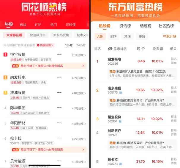 东方财富热榜:融发核电、南京熊猫、恒宝股份、创新医疗、拉卡拉
