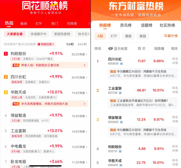 同花顺热榜:利欧股份、四川长虹、华胜天成、领益智造、工业富联