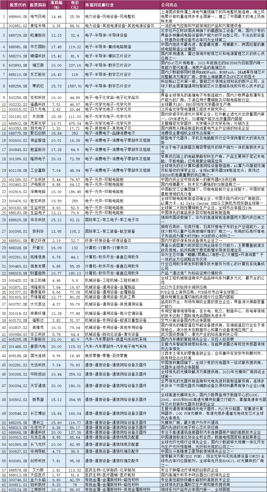 1板:长飞光纤、华升股份、张江高科、江南新材、红 宝 丽、特发信息、沃格光电、国际复材、凯美特气、东山精密、万通发展、斯达半导、英 维 克、天孚通信、崇达技术、金安国纪、飞乐音响、鼎通科技、深南电路、宏和科技、奕东电子、洪田股份、通合科技、大港股份、领益智造、东材科技