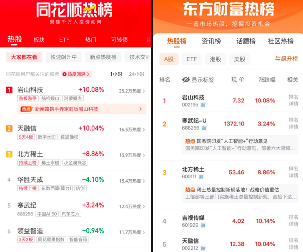 同花顺热榜:岩山科技、天融信、北方稀土、华胜天成、寒武纪