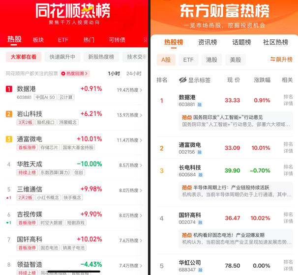 同花顺热榜:数据港、岩山科技、通富微电、华胜天成、三维通信