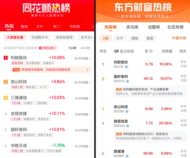 同花顺热榜:利欧股份、岩山科技、三维通信、吉视传媒、国轩高科
