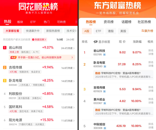 同花顺热榜:岩山科技、吉视传媒、卧龙电驱、利欧股份、国轩高科