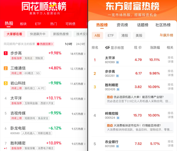 东方财富热榜:太平洋、步步高、胜利精密、岭南控股、农业银行