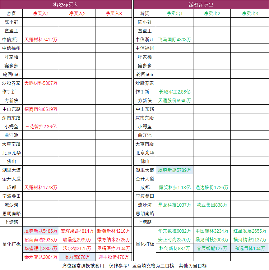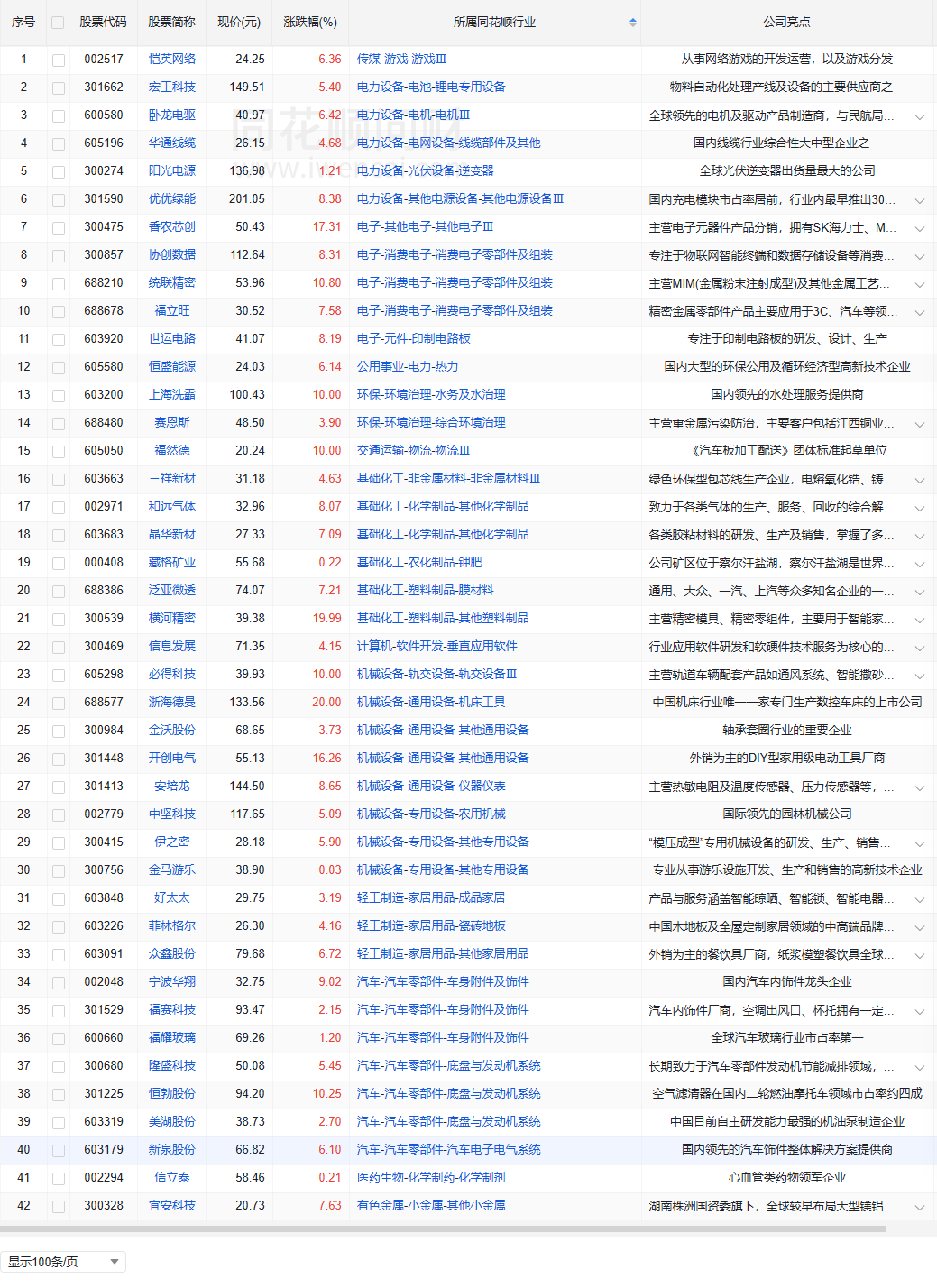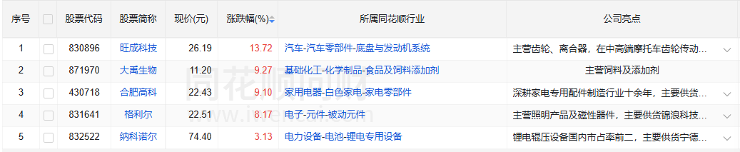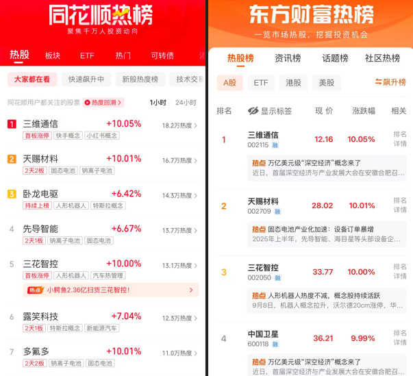 同花顺热榜:三维通信、天赐材料、卧龙电驱、先导智能、三花智控