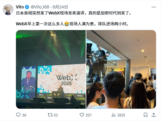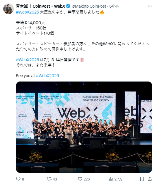 报社(亚太)讯 8月25日-26日,亚洲最具影响力的区块链盛会之一 WebX 2025 在东京盛大举行。作为由日本加密媒体 CoinPost 主办的年度盛会,本届大会吸引了 逾14,000名参会者、160家赞助机构以及170场边会活动,再次证明了其作为全球Web3生态核心交流平台的重要地位。