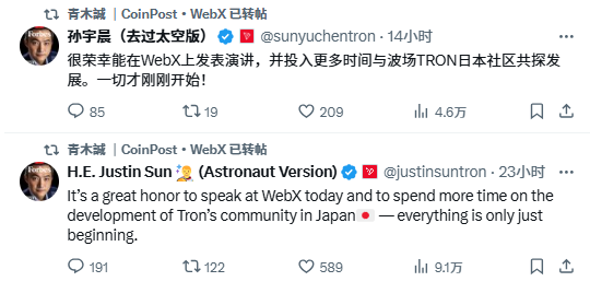 孙宇晨则表示,能在WebX舞台上与全球行业伙伴交流深感荣幸,他将投入更多精力推动TRON在日本的社区发展,“一切才刚刚开始”。