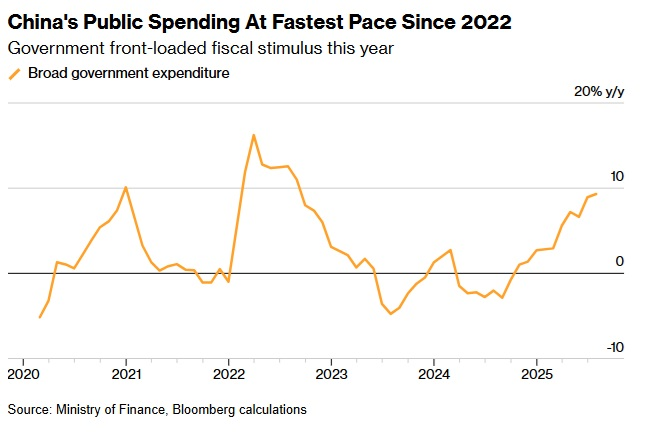 彭博社根据中国财政部周二公布的数据计算得出,2025年前七个月,中国财政总支出同比增长9.3%,达到人民币21.5万亿元(约合3万亿美元)。这是自2022年8月以来的最快增幅。