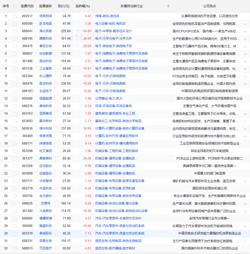 1板:荣联科技、金安国纪、四会富仕、艾华集团、宏和科技、汇源通信、方正科技、剑桥科技、东材科技、科华数据、崇达技术、棕榈股份、徕木股份、中恒电气、通鼎互联、万通发展、中科曙光、奕东电子、兴森科技、炬光科技、澳弘电子、平安电工、应流股份、生益科技、罗曼股份、世嘉科技、海光信息、深南电路、江南新材、良信股份、鹏鼎控股、沪电股份、腾景科技、鼎泰高科、科 士 达、白云电器、金 信 诺、华工科技、立讯精密、大族激光、易 德 龙、沃尔核材、中京电子