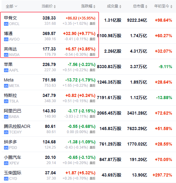 甲骨文大涨36%收于纪录新高,日内市值暴增约2500亿美元。