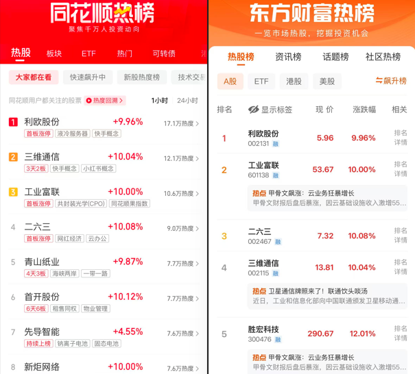 同花顺热榜:利欧股份、三维通信、工业富联、二六三、青山纸业