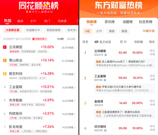 同花顺热榜:立讯精密、青山纸业、胜宏科技、工业富联、先导智能