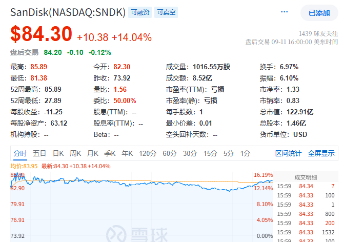 四、美股存储芯片走强 闪迪涨超14% 美光科技涨超7%