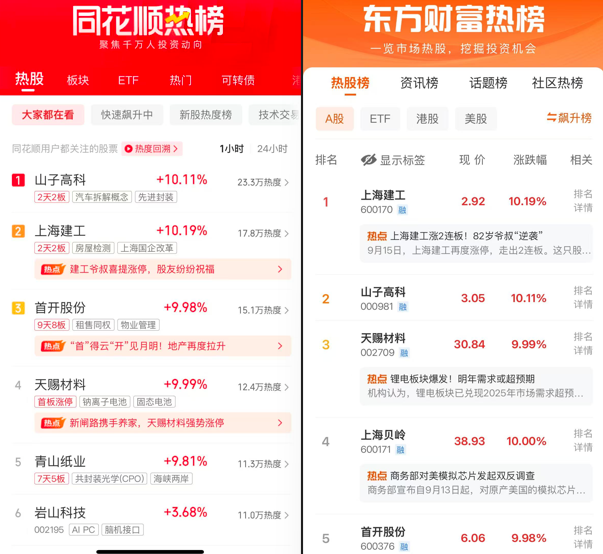 同花顺热榜:山子高科、上海建工、首开股份、天赐材料、青山纸业