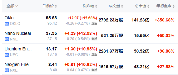 当地时间周一,美国能源部长克里斯赖特表示,美国应考虑扩大战略铀储备,以减少对俄罗斯供应的依赖,并增强外界对核电长期前景的信心。赖特表示,美国正在全力以赴重塑核燃料供应链。在未来十年内,利用核聚变能源发电是可能的,商业核聚变发电最快可能需要8年。核电概念股盘中应声大涨,Oklo涨15%,Nano Nuclear涨12%,Uranium Energy涨10%,Nexgen Energy涨10%。