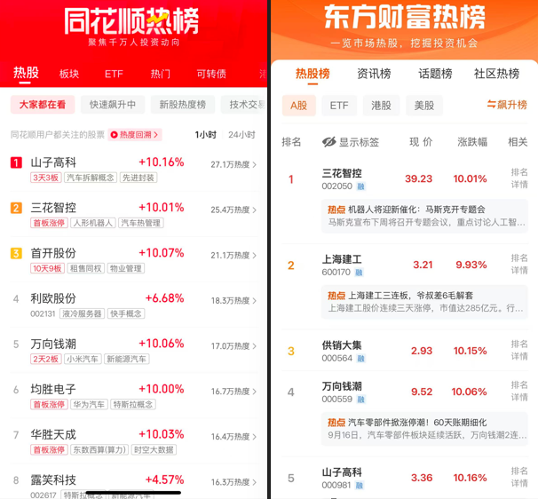 同花顺热榜:山子高科、三花智控、首开股份、利欧股份、万向钱潮