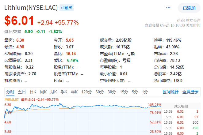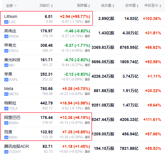 美洲锂业公司(Lithium Americas)收涨95%,报道称美国政府寻求获得美洲锂业公司高达10%的股份,目前白宫方面正在重新商谈美国能源部对该公司一笔23亿美元贷款的条款。美洲锂业与通用汽车合资开发Thacker Pass锂矿项目,该项目预计2028年投产且被美国视为建立国内供应链的关键。入股美洲锂业公司将是美国政府干预美国经济、加速关键矿产本地供应链发展的最新例证。该项目也被视为构建美国国内锂供应链的关键一环,符合美国政府长期推动提高美国锂产量的战略。