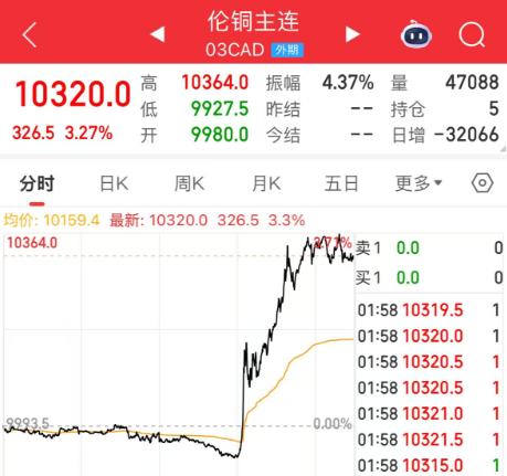 LME伦铜涨幅3.27%,最新报10320美元/吨,创2024年6月以来最高水平。