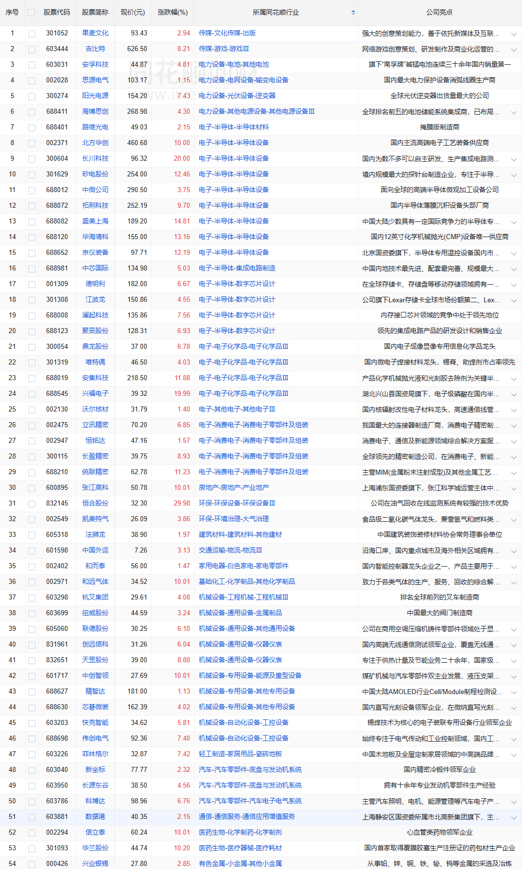 1板:通富微电、中山公用、恒合股份、东方明珠、神工股份、洪田股份、联合化学、江丰电子、彤程新材、海信视像、北方华创、格 林 达、百 合 花、和远气体、兴福电子、至正股份