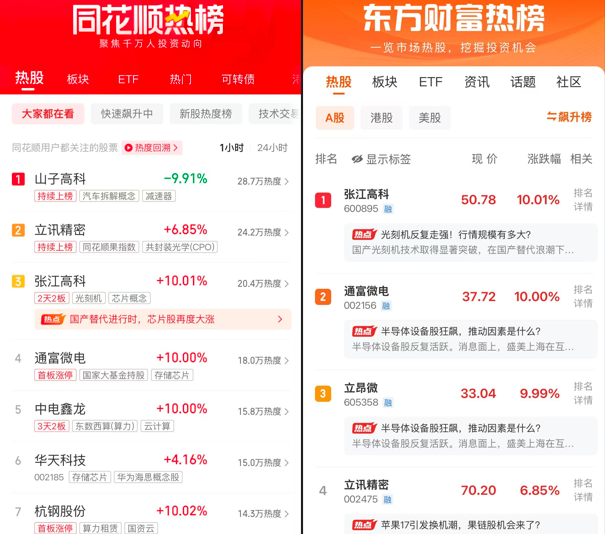 同花顺热榜:山子高科、立讯精密、张江高科、通富微电、中电鑫龙